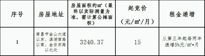 为提高国有资产经营效益,江西金开正合实业有限公司位于儒乐星镇杏茂商业街商2地块第7栋,坐落于南昌市金山大道以东、滨湖南路以南,金云东路以北处,面积:3240.37㎡。现对外公开进行出租经营权竞拍,现对有关事项公告如下: