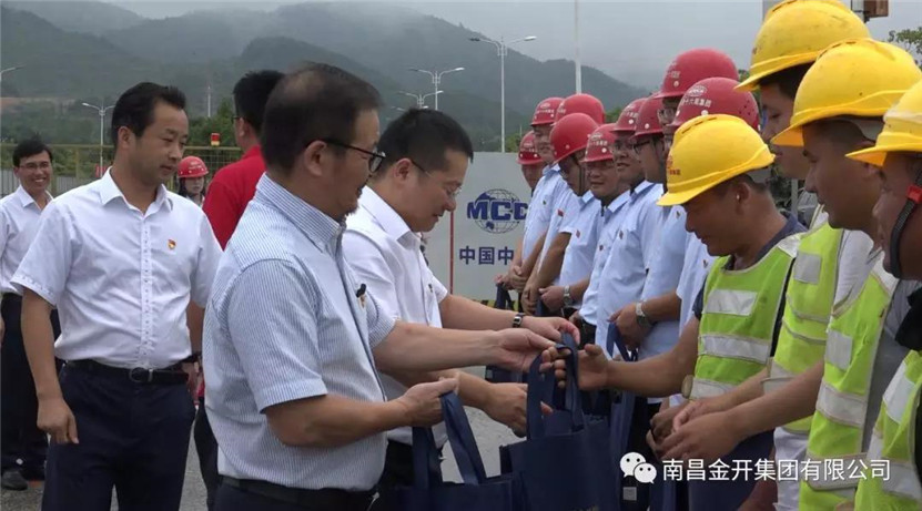 为庆祝建党97周年,凝心聚力项目工程,7月1日,金开集团党委书记、董事长胡顺明带队走访慰问了“EPC”临时党支部的一线党员。集团党委副书记、总经理潘贤林,党委副书记、副总经理熊爱华,党委委员、副总经理袁扣华、周云,党委委员、纪委书记方义发参加。